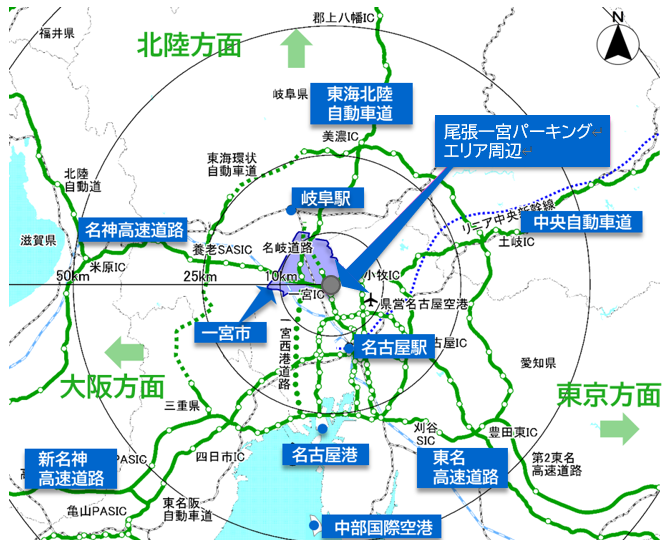 名神高速道路、東海北陸自動車道及び名古屋高速道路16号一宮線などの高速道路ネットワークや国道22号などの幹線道路が充実し、名古屋と岐阜間のみならず、東京、大阪、北陸方面と日本全国へのアクセス拠点となっている日本有数の交通の要衝です。